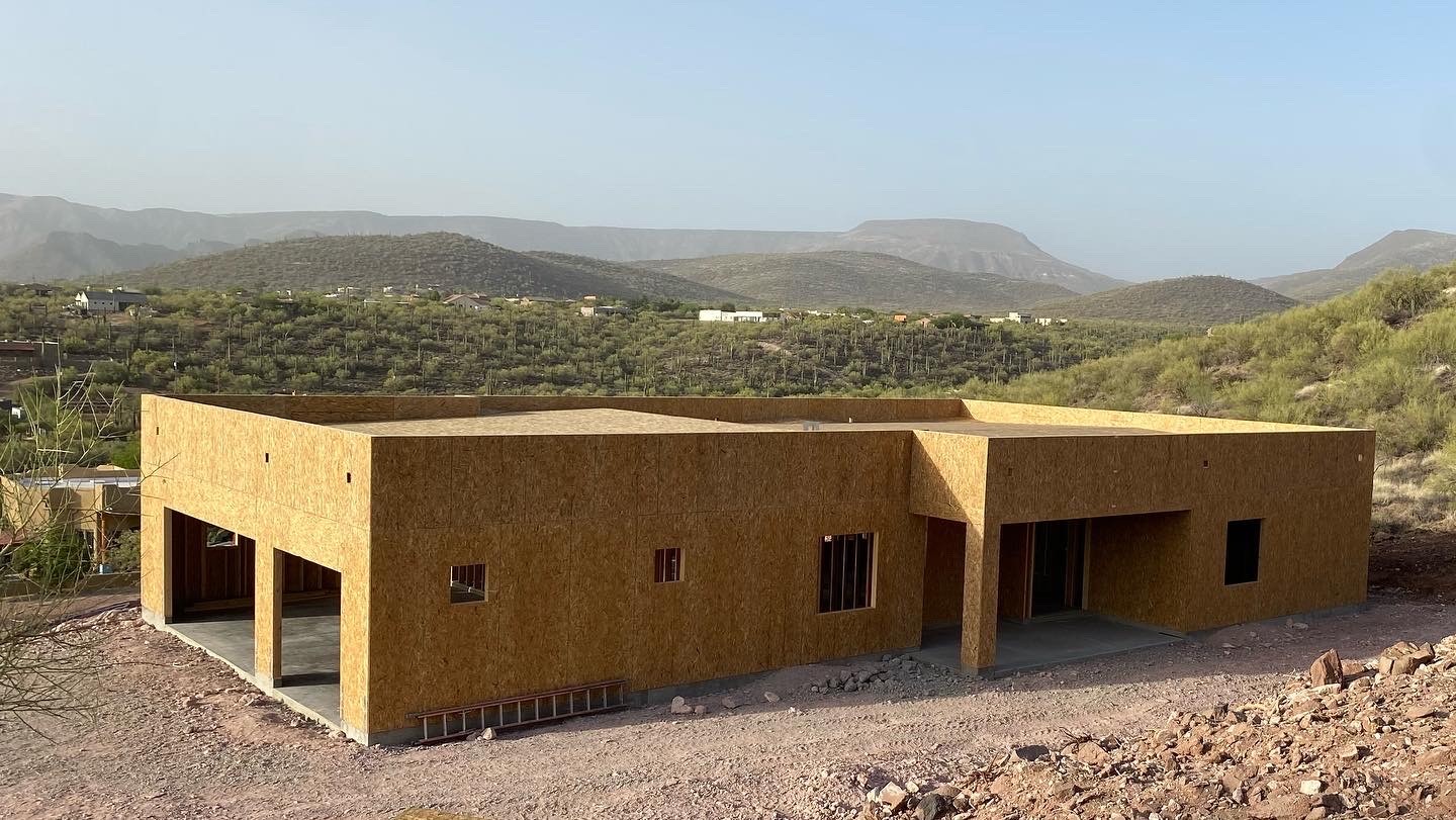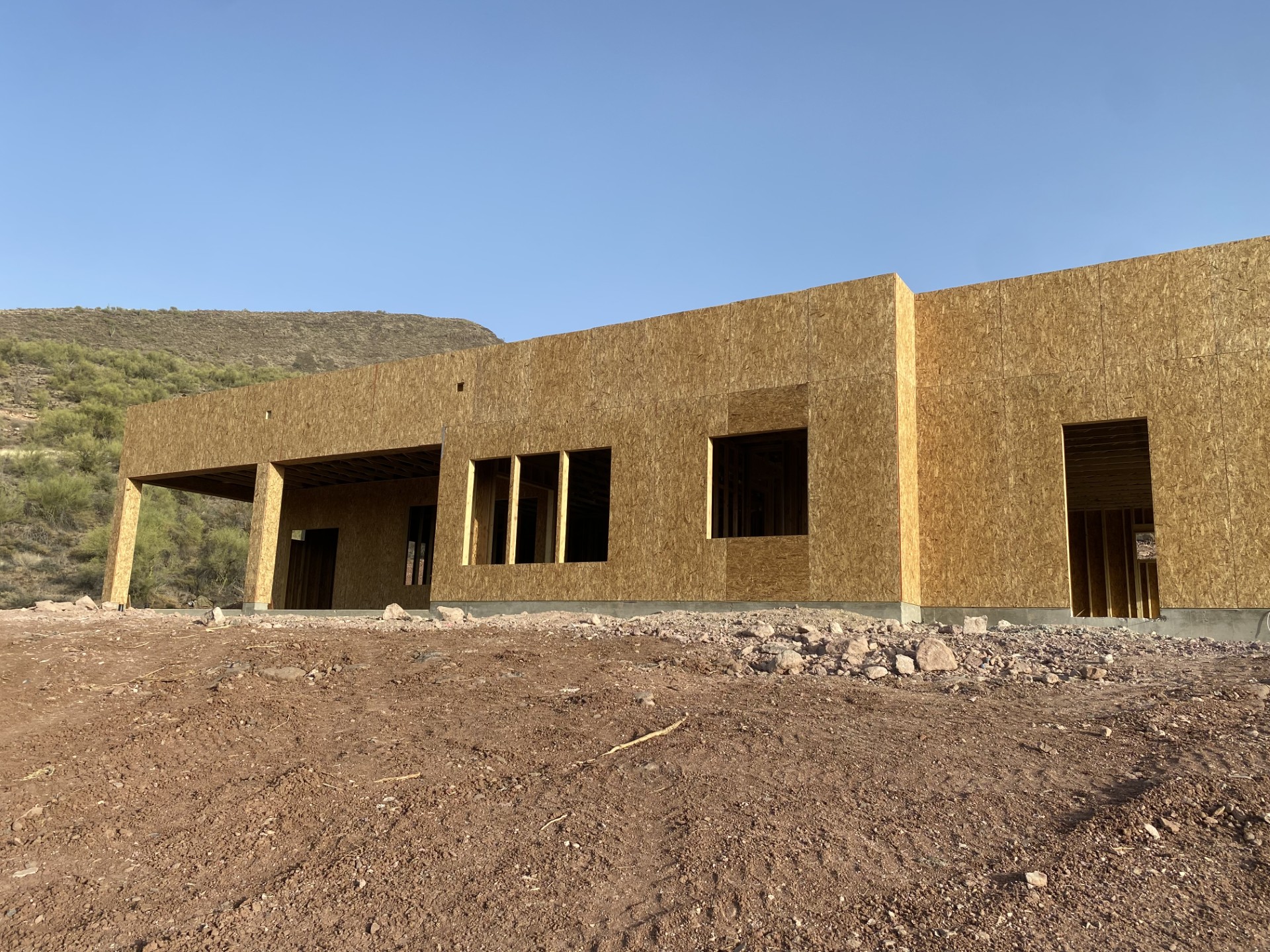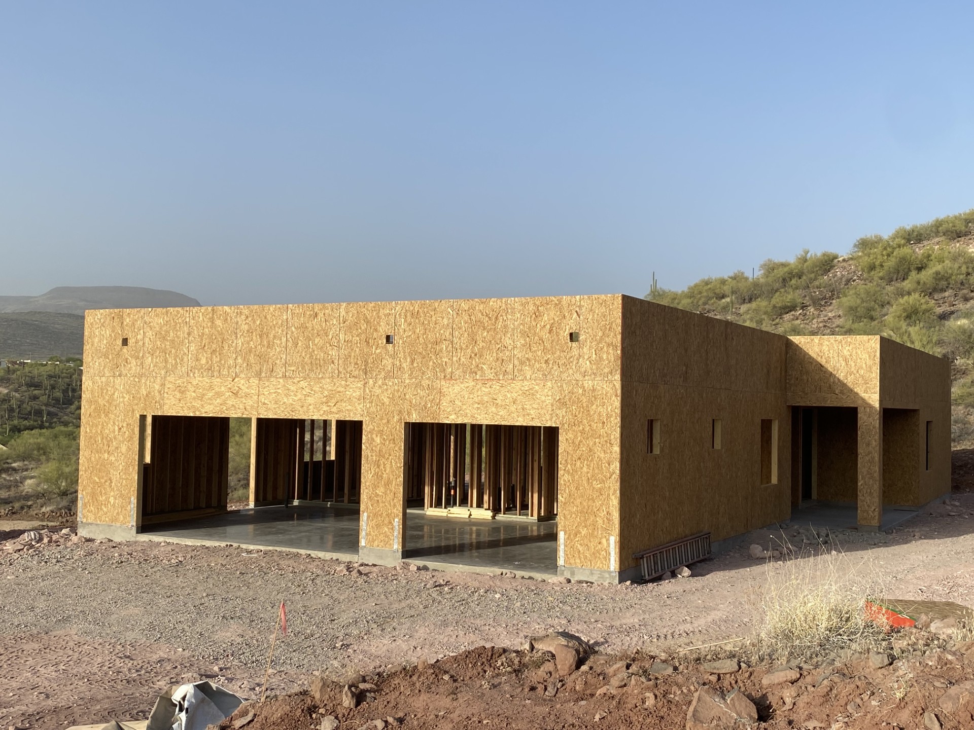 This impressive custom home framing project in Phoenix, Arizona showcases modern desert architecture perfectly suited for the Sonoran landscape. The expansive single-story design features clean geometric lines and multiple living zones, creating a sophisticated retreat among the iconic saguaro cacti and rolling desert hills.