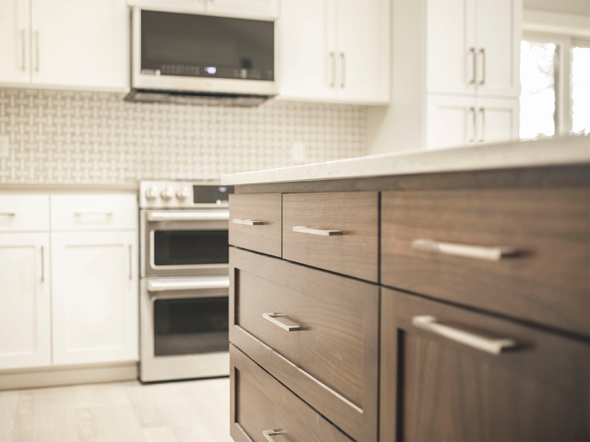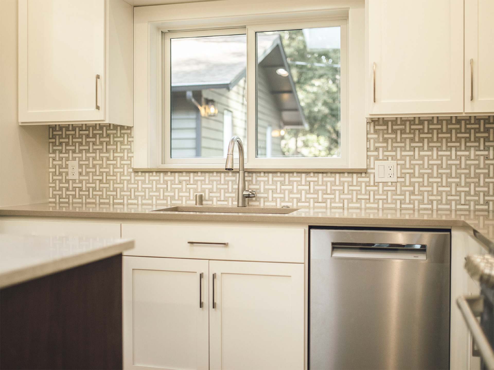 The open-concept kitchen showcases premium finishes including geometric tile backsplash, quartz countertops, and stainless steel appliances. Custom storage solutions and clean-lined cabinetry extend to the ceiling, optimizing every inch of space while maintaining an uncluttered, airy feel throughout the living areas.