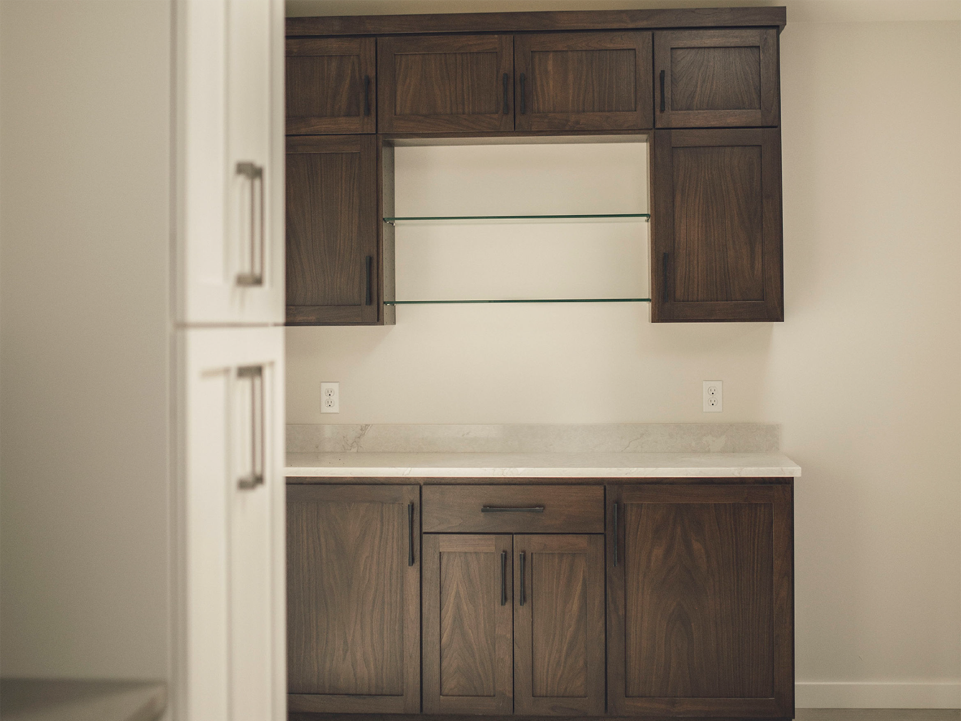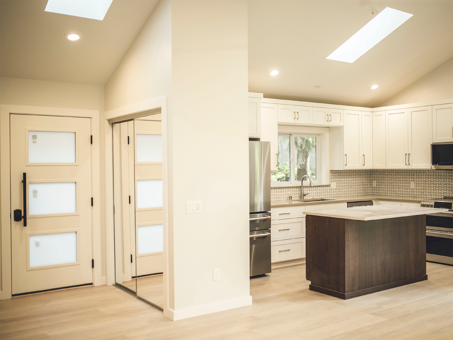 This beautifully designed 1,200 square foot ADU in Snohomish, Washington exemplifies modern efficiency and thoughtful craftsmanship. The residence features a sophisticated neutral palette with crisp white cabinetry complemented by rich walnut wood accents, creating a warm yet contemporary aesthetic that maximizes the compact footprint.