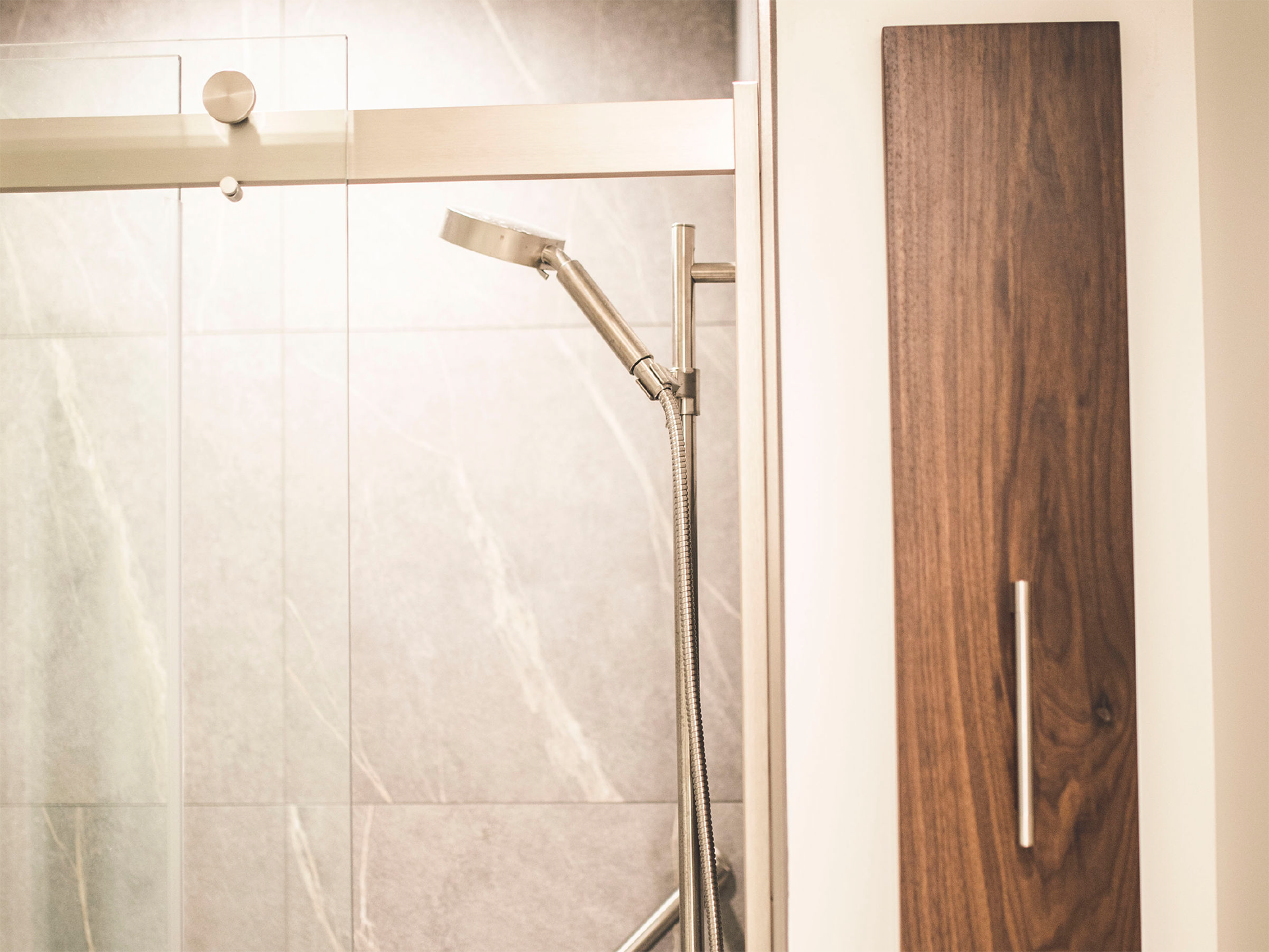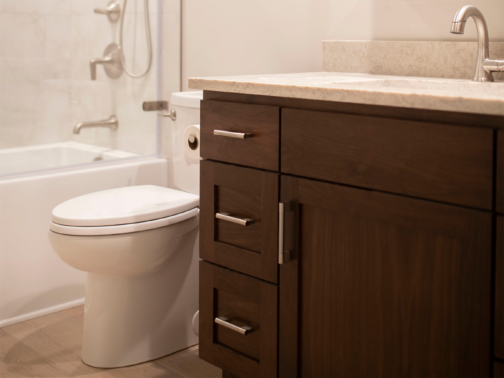 Natural light floods the interior through strategically placed windows, enhancing the sense of spaciousness and connecting residents to Snohomish’s scenic surroundings. The bathroom features a modern glass-enclosed shower and matching walnut vanity, while luxury vinyl plank flooring provides durability and visual continuity throughout the unit.